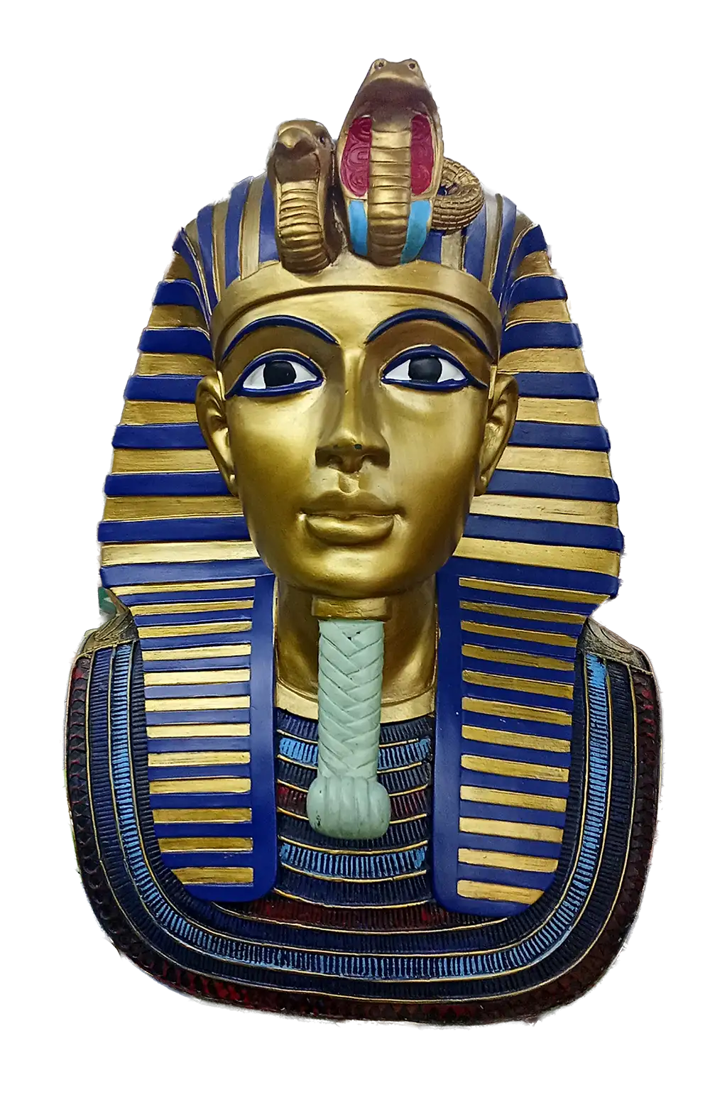 Figura de busto del rey Tutankamón de la dinastía egipcia, con máscara de cobra dorada y buitre.