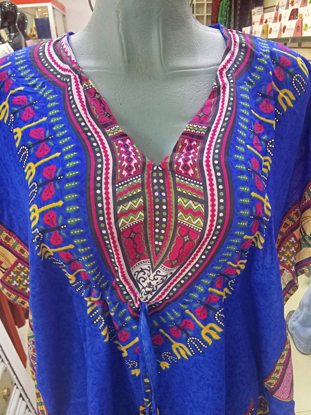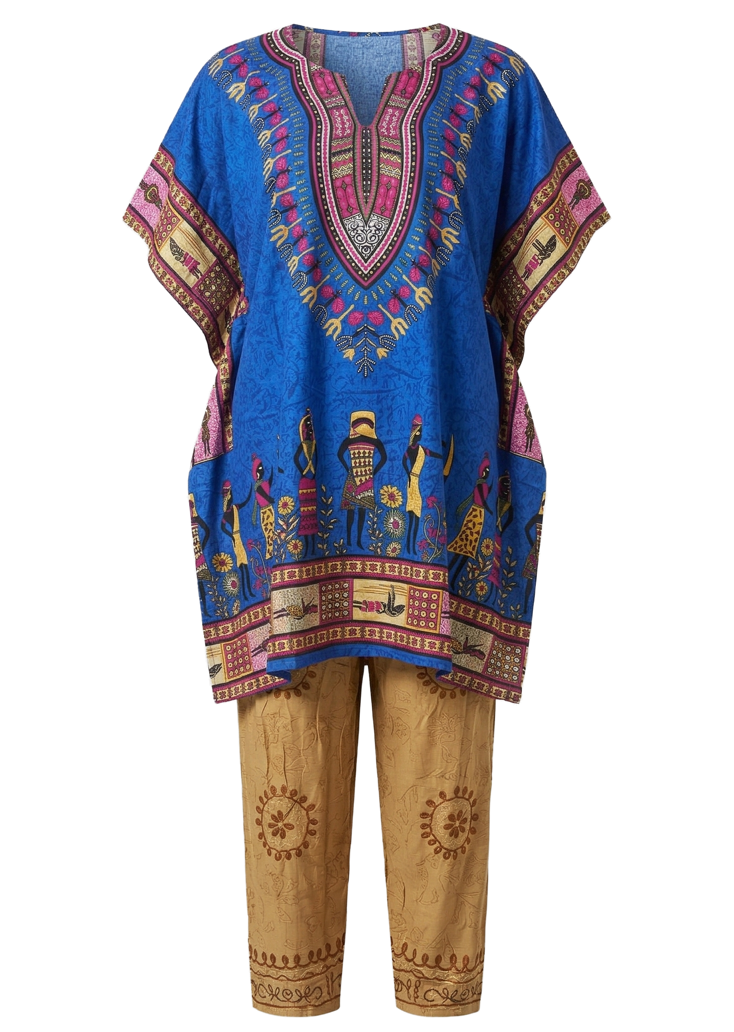 Este conjunto combina una túnica tipo kaftan de corte suelto con un pantalón coordinado, creando una silueta relajada con fuerte presencia visual. El diseño central tipo dashiki en el pecho concentra la atención con patrones geométricos y colores contrastantes que evocan tradición y energía cultural.