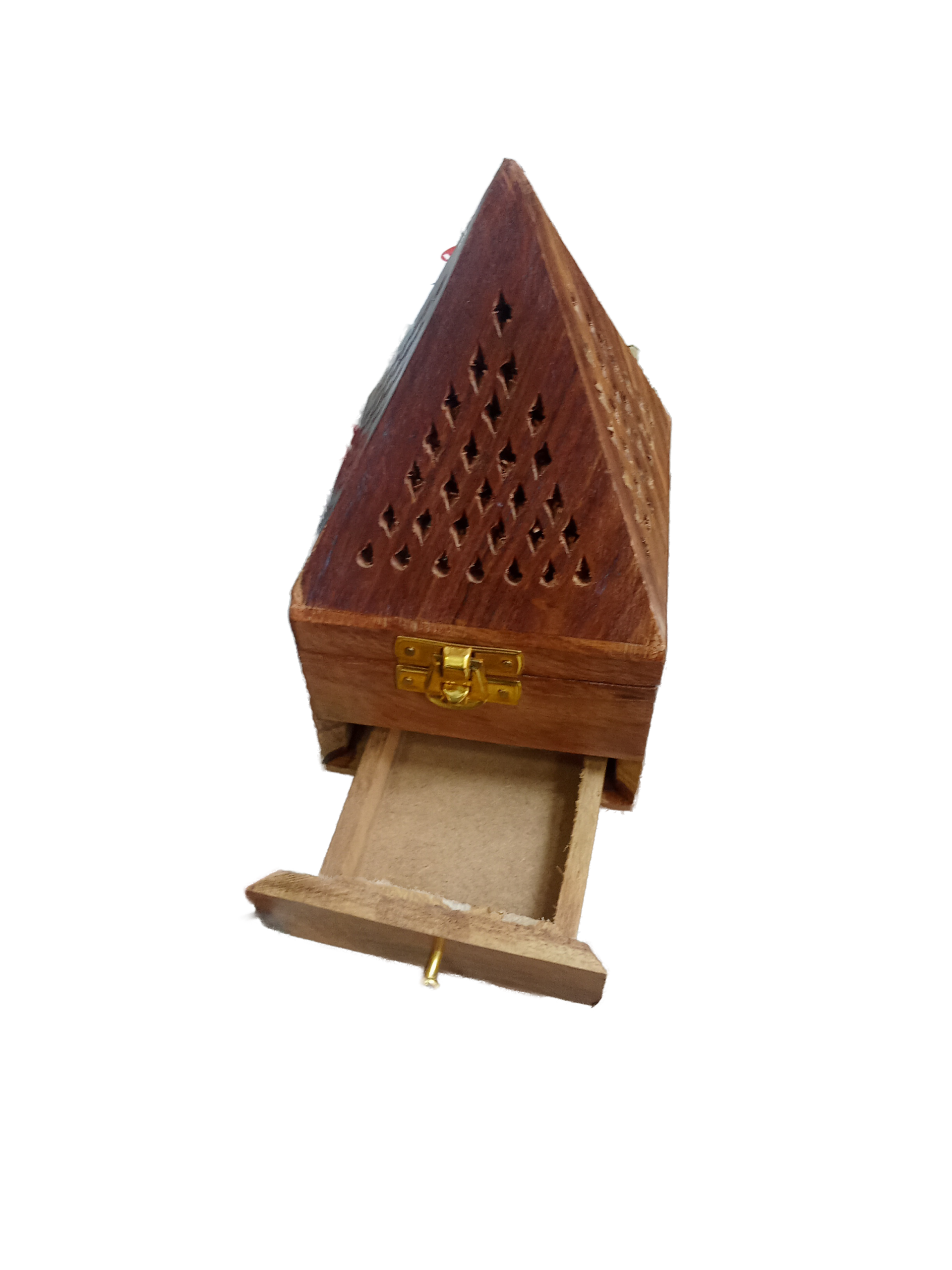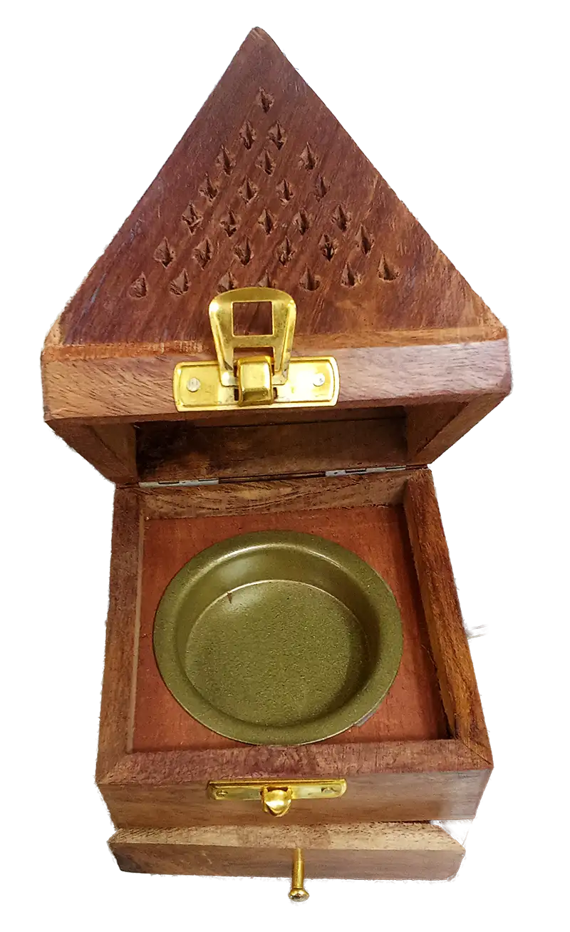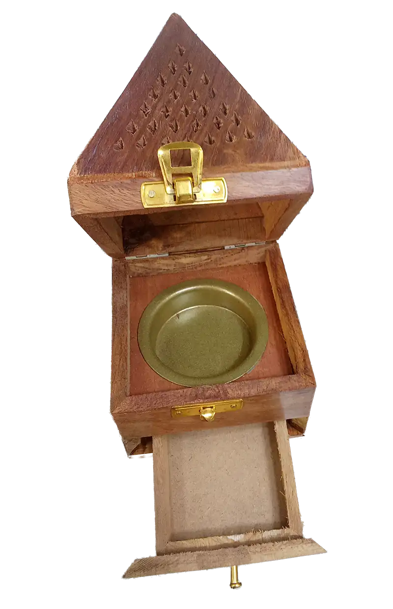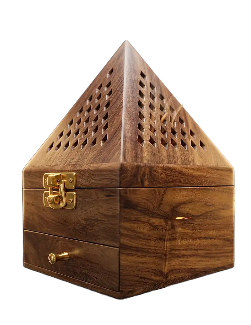 Elegante incensario con diseño geométrico en forma de pirámide, tallado a mano en madera natural de alta calidad. Su estructura no solo funciona como un objeto decorativo de estilo rústico y espiritual, sino que está diseñada para optimizar la difusión del aroma en cualquier espacio.